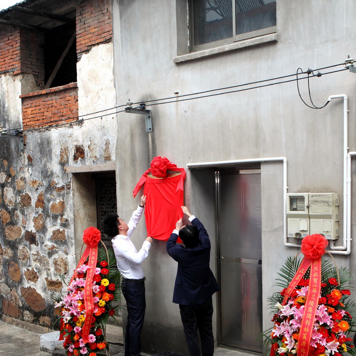 集團(tuán)公司董事長(zhǎng)總經(jīng)理陳春源(右一)、副總經(jīng)理陳明錚為江蘇蘭陵集團(tuán)創(chuàng)始策源地揭牌